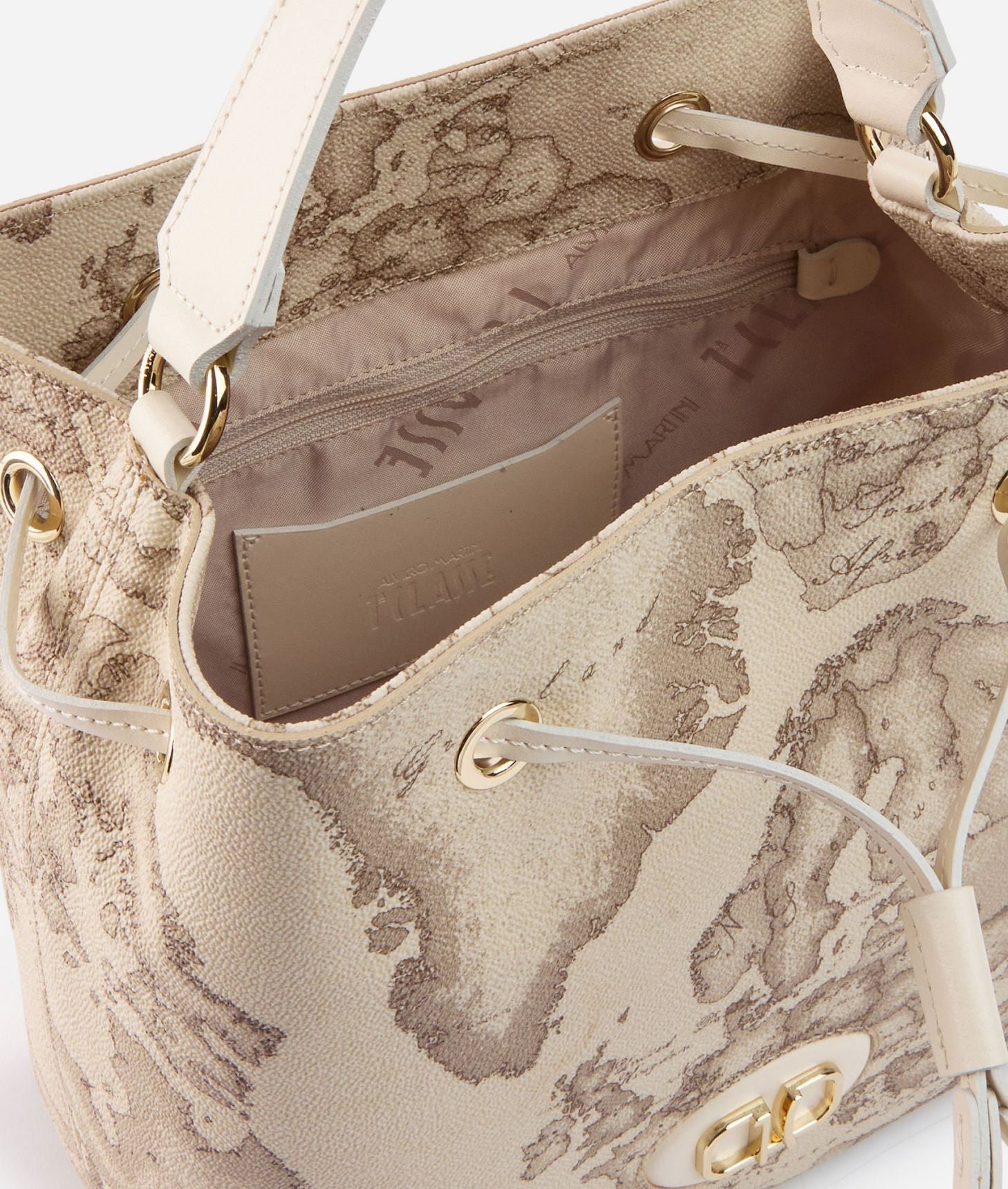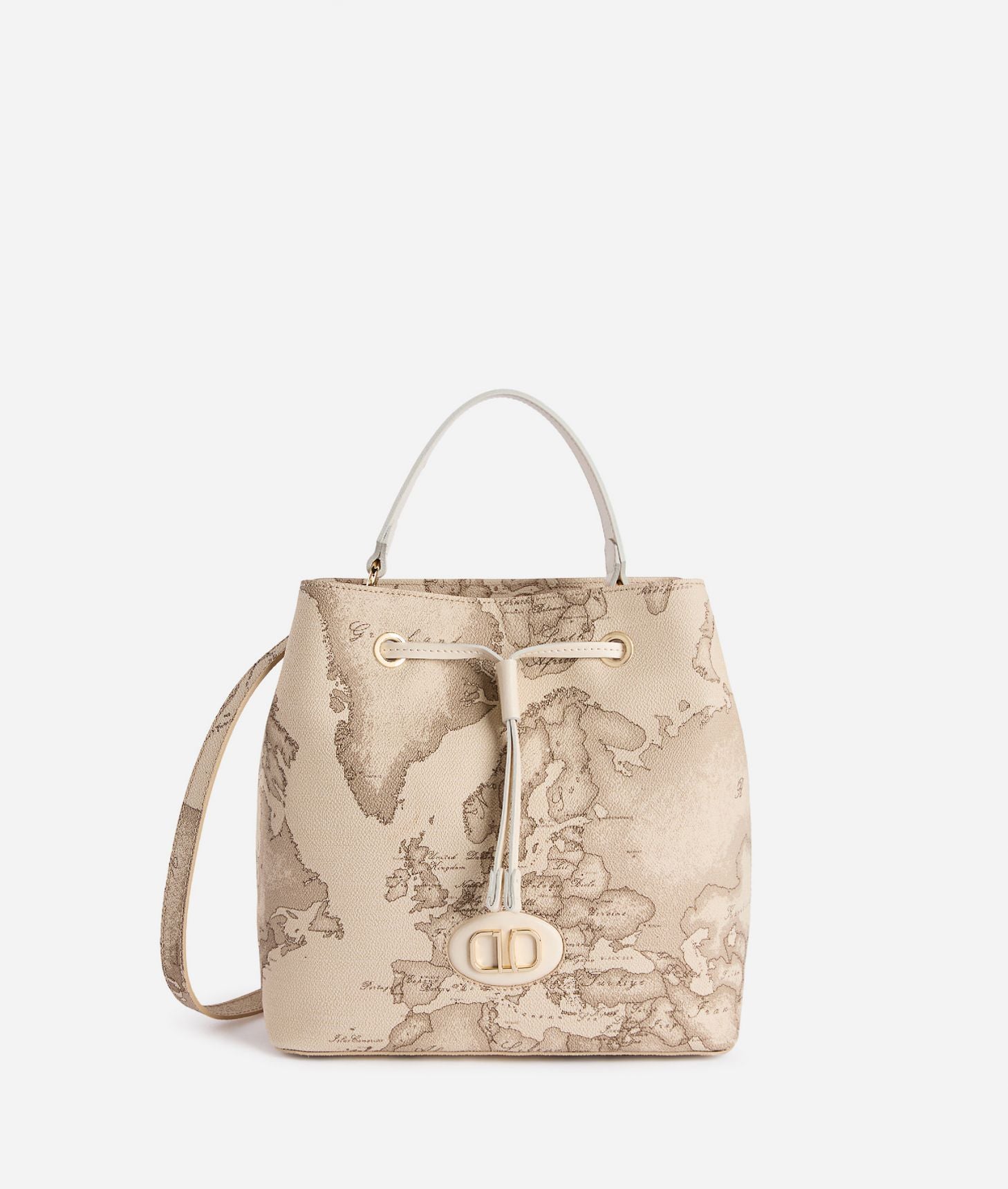 Le linee morbide della borsa secchiello Sand Safari Geo valorizzano l'attitude naturale del tessuto Geo Safari, dove la mappa del brand si tinge dei delicati toni della sabbia. Le sfumature sono messe in risalto dalla pelle liscia color Rafia del manico e della chiusura con coulisse: il patch frontale accoglie il logo 1C in oro chiaro, in un gioco di cornici che impreziosisce il modello. Dotato di tre tasche interne e di tracolla rimovibile in tessuto Geo Safari, risulterà distintivo e raffinato sia negli outfit neutri sia in quelli più variopinti.