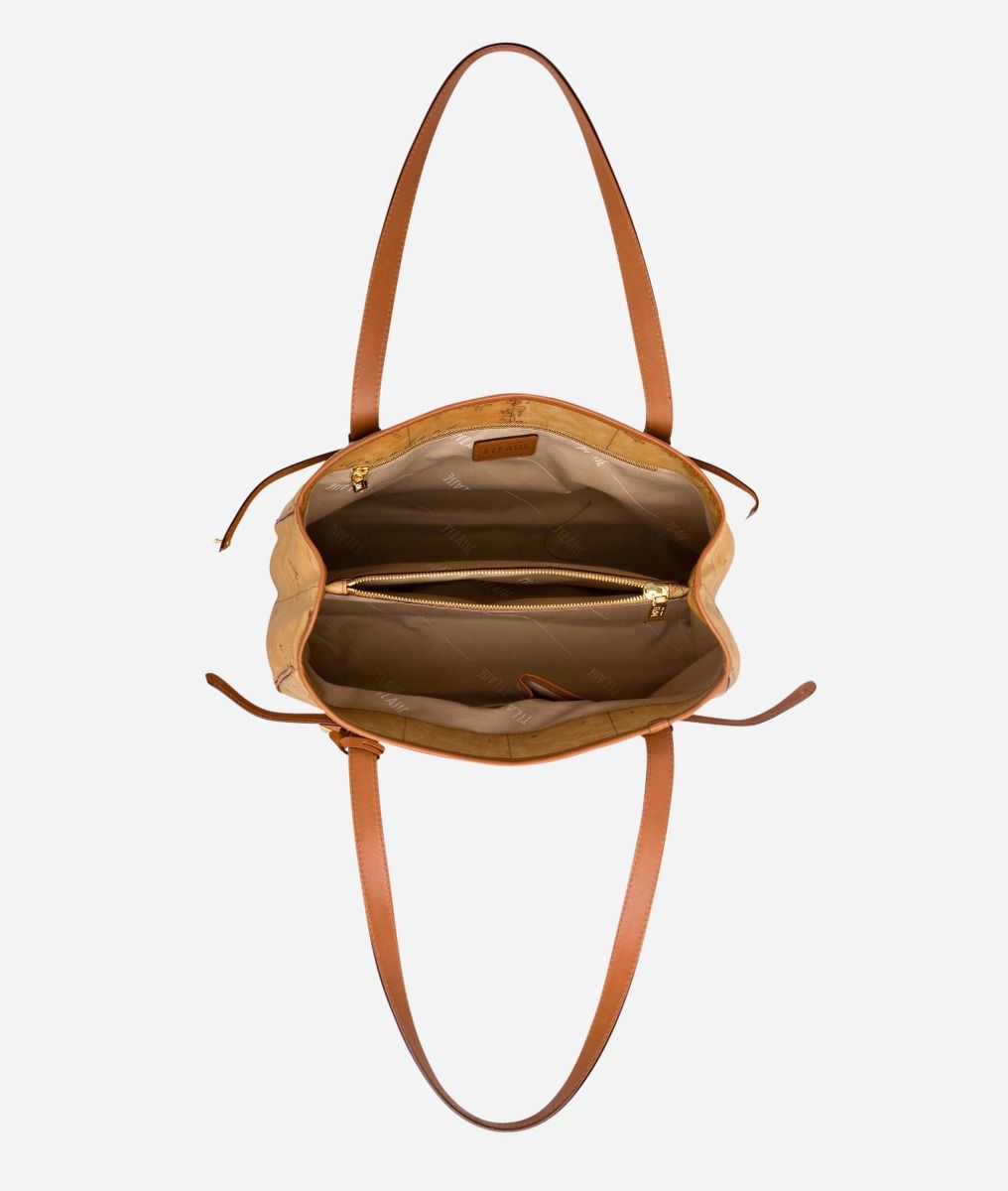 Borsa a spalla in tessuto stampato con cartina geografica Geo Classic con manici in pelle color cuoio, fibbiette frontali con logo 1AClasse, tre scomparti interni. Femminile e capiente, con i dettagli tipici della lavorazione Made in Italy, coniuga praticità ed estetica.