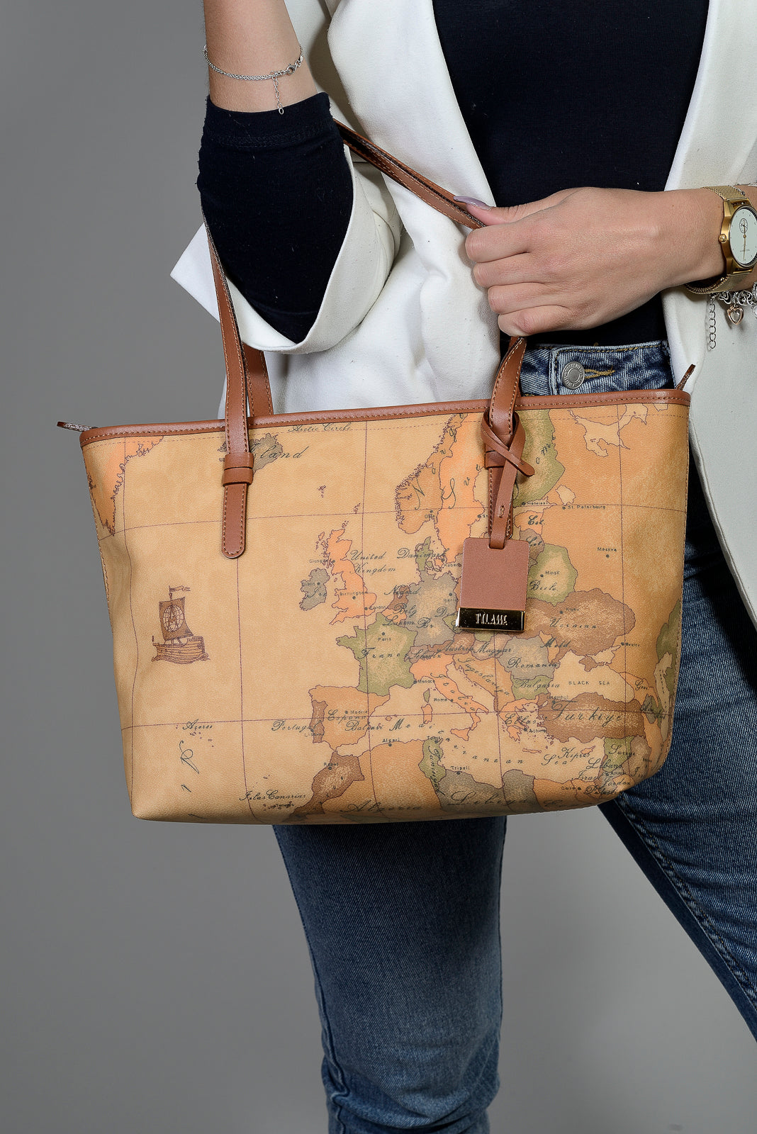 - Borsa shopping orizzontale in tessuto stampato con cartina geografica Geo Classic