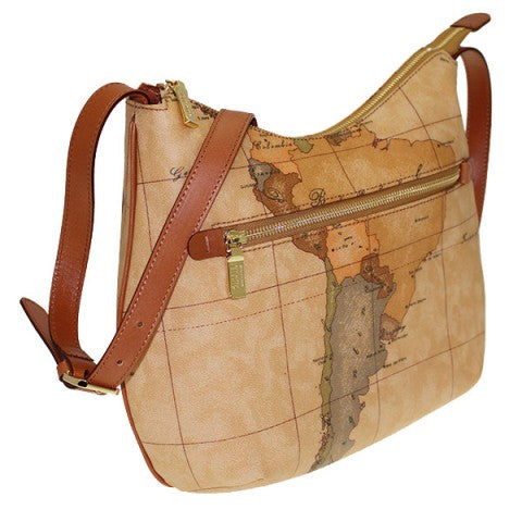 Borsa a bandoliera Alviero Martini della collezione Geo, chiusura con zip, tasca con cerniera, tracolla e rifiniture in pelle. Dimensioni: 32 x 28 x 10 cm.