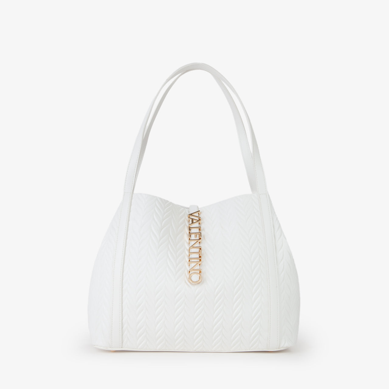 Shopping a spalla, dalla finitura goffrata, con logo di metallo, dorato, che si poggia sul davanti in verticale.